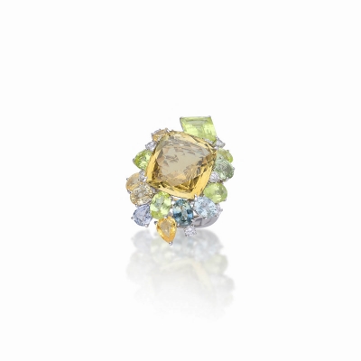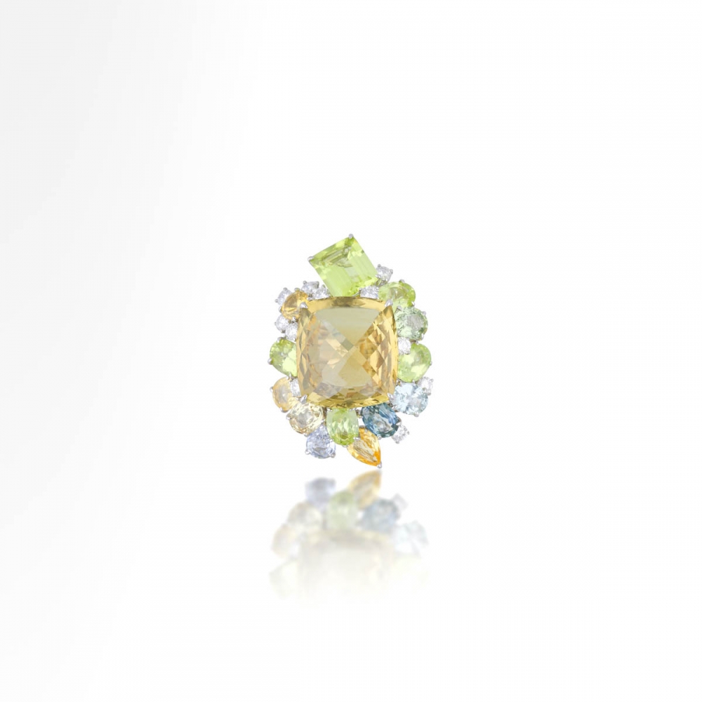 金綠寶石(Chrysoberyl)成分為鈹鋁氧化物,硬度8.5,一般都是帶著淡淡的金黃色、黃綠色或褐黃色,折射率跟硬度都非常高,是一種十分適合每天配戴的一種彩色寶石。近期寶石市場颳起了療癒色系的風潮,也讓金綠玉寶石獨特的黃綠-藍綠色系廣受歡迎; 此金綠玉貓眼戒指設計的十分繽紛多彩,匠心獨具,做為五大彩寶之一,也都是各大拍賣會每次拍賣不可或缺的焦點,也屢屢創下高價,此戒指是您購入金綠玉的最佳選擇。