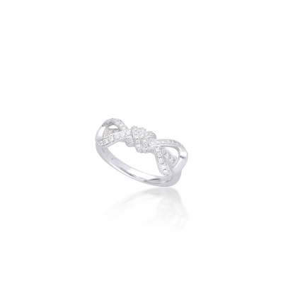 這枚戒指設計如緞帶蝴蝶結,18K金打造,鑲嵌 61 顆鑽石,總重 0.31 克拉。小鑽排列緊密,火彩閃爍連綿不斷,形成華麗光暈。日常搭配也都能凸顯浪漫與甜美氛圍。