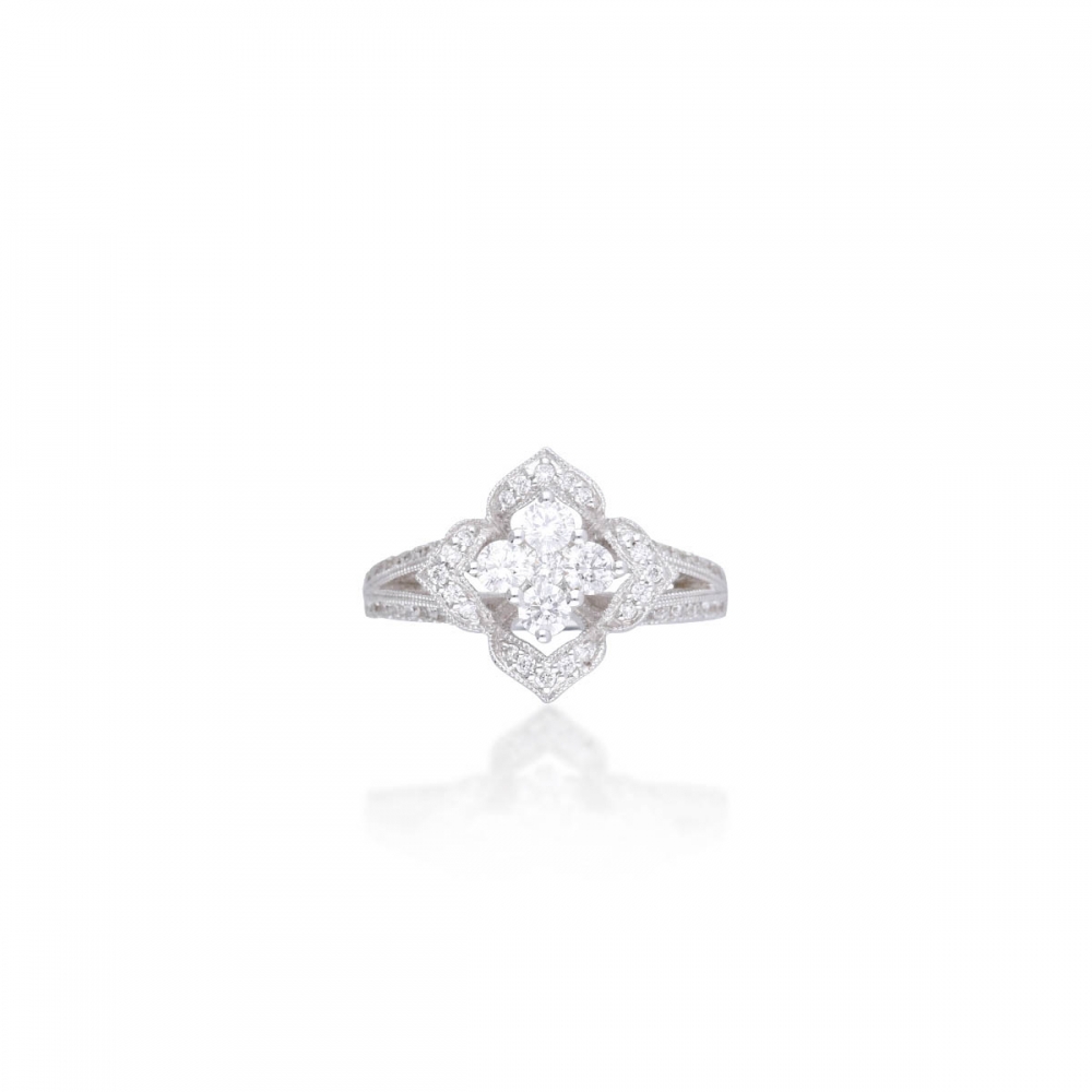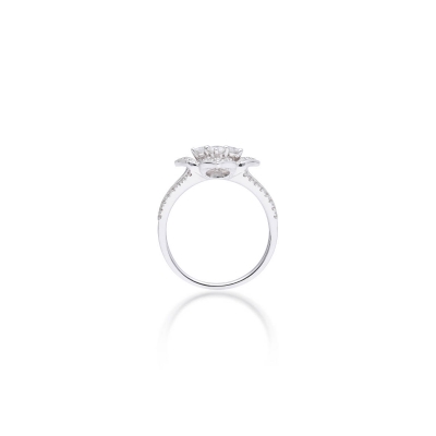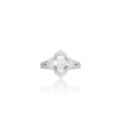 此款戒指造型層次感十足,由中央主鑽搭配多顆小鑽組成。57顆鑽石共 0.66克拉,總重設計精巧。材質18K 金,亮度純淨。多層次的鑽石排布營造華麗效果,閃耀度極佳,佩戴後立體感強烈,適合追求存在感的佩戴者。