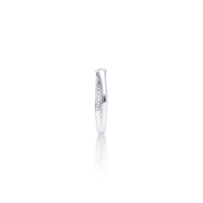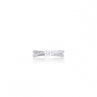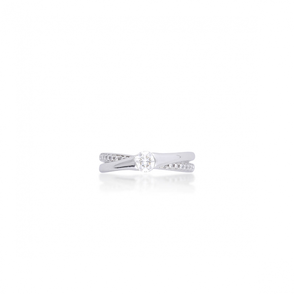 戒指造型簡潔,戒環帶有微微弧度,線條俐落。材質為18K金,整體設計舒適貼合。鑲嵌主鑽 0.30 克拉,成色 F、淨度 VS1,輔以 21 顆小鑽共 0.14 克拉,光澤感明亮。主鑽附有GIA 證書,品質有保障。外型低調卻帶有專業鑑定背書,適合作為日常配戴與重要場合的首飾。