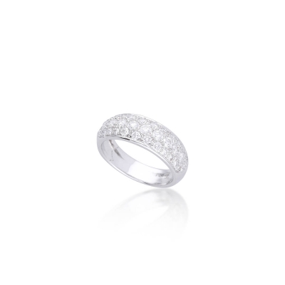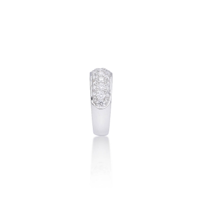 此款戒指設計簡潔大方,呈現圈式的排鑽風格。戒身以 18K金打造,線條流暢而貼合手型。整圈鑽石排列均勻,火彩細膩,讓戒指在低調中散發閃耀光澤,適合單獨佩戴展現質感,也能搭配其他戒指疊戴,成為日常穿搭的百搭款式。