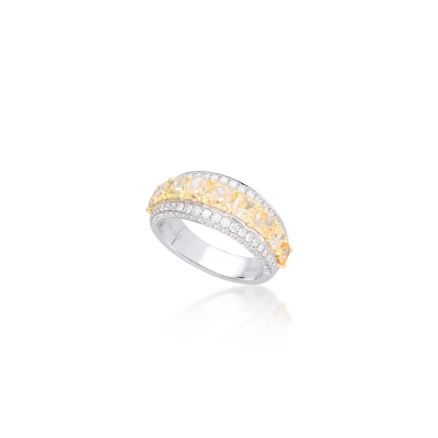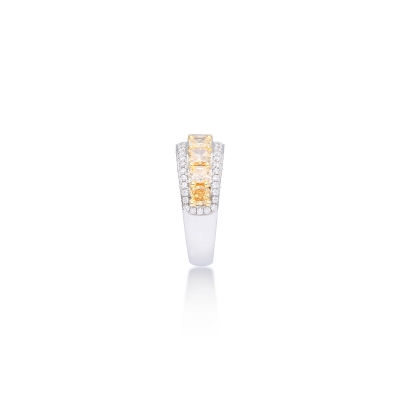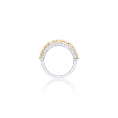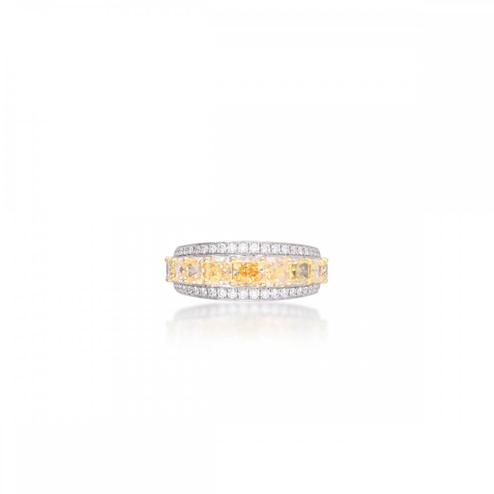 這枚戒指以9顆璀璨黃鑽為主石,總重達2.03克拉,色彩鮮明奪目,盡顯非凡氣派。周圍環繞104顆無色美鑽,總重0.57克拉,如璀璨星火般熠熠生輝,完美烘托主石魅力。戒台採用18K黃金與18K白金雙色材質,交織出溫潤與純淨的對比美感,精緻工藝與奢華質感並存,是值得珍藏的珠寶佳作。