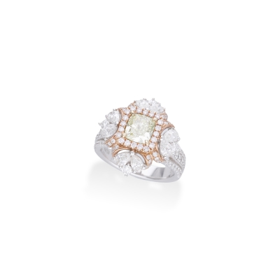 這枚戒指瑰麗非凡,主石為1.21克拉枕形切割黃鑽,附GIA證書,其飽和色澤與璀璨火彩令人傾心。20顆總重0.18克拉的粉紅鑽石與8顆總重0.85克拉的水滴形鑽石,交織出柔美漸層的光暈;再以86顆總重0.64克拉的圓鑽密鑲襯托,綻放極致璀璨。戒台以18K金精心鑄造,完美烘托寶石的溫暖光芒,整體設計既顯奢華氣派,又蘊藏精工細節,是見證永恆的絕佳之作。