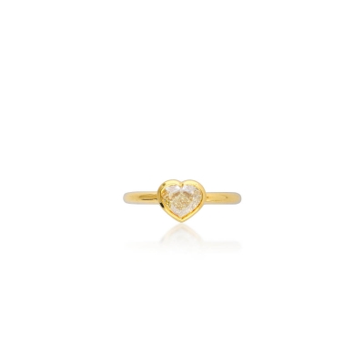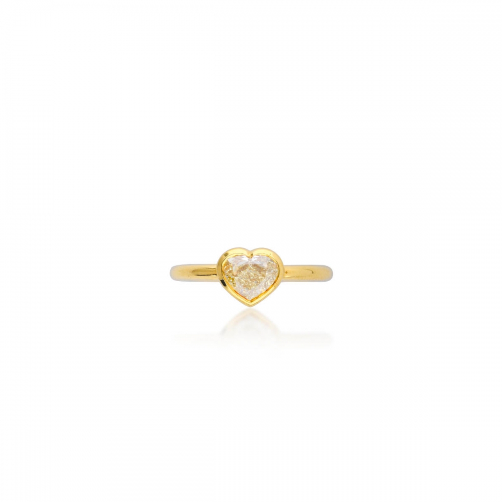 這枚彩鑽戒指以浪漫的心形為設計焦點,主石重達 1.01 克拉,為淡彩黃鑽(F.L.Y.),淨度 VVS2,切工評級 VG–VG,附有GIA證書。戒身採用18K黃金,映襯黃鑽更顯溫潤光澤。心形鑽石象徵真摯情感與浪漫,線條簡約卻極具辨識度,既能單獨成為視覺焦點,也適合作為紀念愛意或典藏之選。