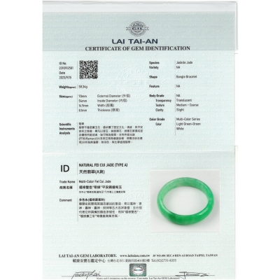此款翡翠手鐲為天然 A 貨翡翠,附賴泰安寶石鑑定證書,來源清楚。整體色澤呈滿綠分佈,綠色覆蓋度高,視覺表現均勻且具有連續性,帶出典型翡翠的沉穩與存在感。結構屬豆種至糯種之間,玉質呈現細緻顆粒感並帶些許潤度,兼具一定透感與厚實度,屬於市場接受度高的實戴型等級。手鐲為圓條設計,比例協調,拋光完整,佩戴時貼手滑順。整體份量感適中,日常配戴不易突兀,同時保有傳統玉鐲的經典氣質,適合重視顏色表現與穩定佩戴性的選擇。
