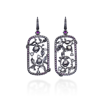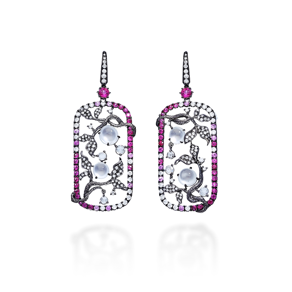 花窗玻璃為西方建築裝飾品,常見於教堂,裝置於建物牆面上,此件作品融合了西方窗花之美及東方代表性之珠寶,玻璃種翡翠,氣質高雅,適合擁有高雅品味的您,縷空雕花的設計,賦予貴重耳墜輕巧活潑的生命力,溫潤的白翡巧妙點睛,紅寶瑰麗,美麗閃耀,花間葉影,夢想綻放,初遇即是驚豔。