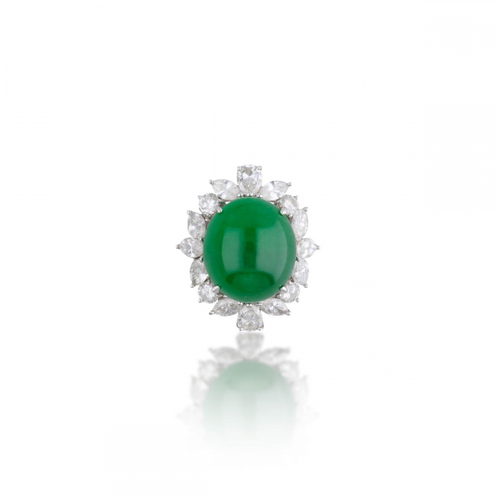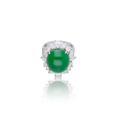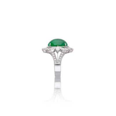 翡翠作為華人最具代表性的綠色寶石,不管是其溫潤優雅的氣質,有別於其他寶石的璀璨,其內斂的風格更能凸顯出女性的優雅,從古至今每一塊原石都是天地的寶貴賜予。就切割寶石來角度來說,翡翠蛋面是集所有整個翡翠原石中,最精華的地方,也就是正濃陽勻兼備才會考慮取出蛋面做為切磨的形式,此款蛋面戒指以經典的滿綠色翡翠為主體,更難得的是此翡翠戒指的主石顏色非常飽滿濃郁的滿綠外,翡翠玉質溫潤瑩透,璀璨鑽石輔以圍繞,充分展現華人女性特有的婉約氣質,光華更盛,是雅致品味的表達,推薦給您。