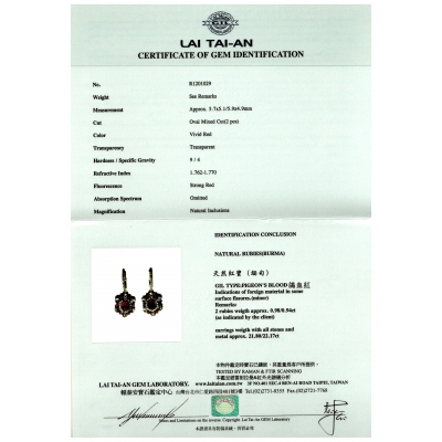 在古代西方社會,紅寶石被認為是上帝創造萬物時所創造的12種寶石中最珍貴的,因為紅寶石最美、最神聖、最具生命力。象徵著熱情似火,愛情的美好、永恆和堅貞。紅寶石(Ruby)的意義是「寶石之王」,它紅豔且瑰麗奪目的色彩像永不熄滅之火,象徵著熱情與愛意,此對紅寶石顏色為鴿血紅色,耳環鑲嵌精緻,典雅,設計師運用白鑽及紅色小剛玉的對比搭配鑲嵌出有如雪花般的亮麗造型,落落大方,非常適合平常佩戴。