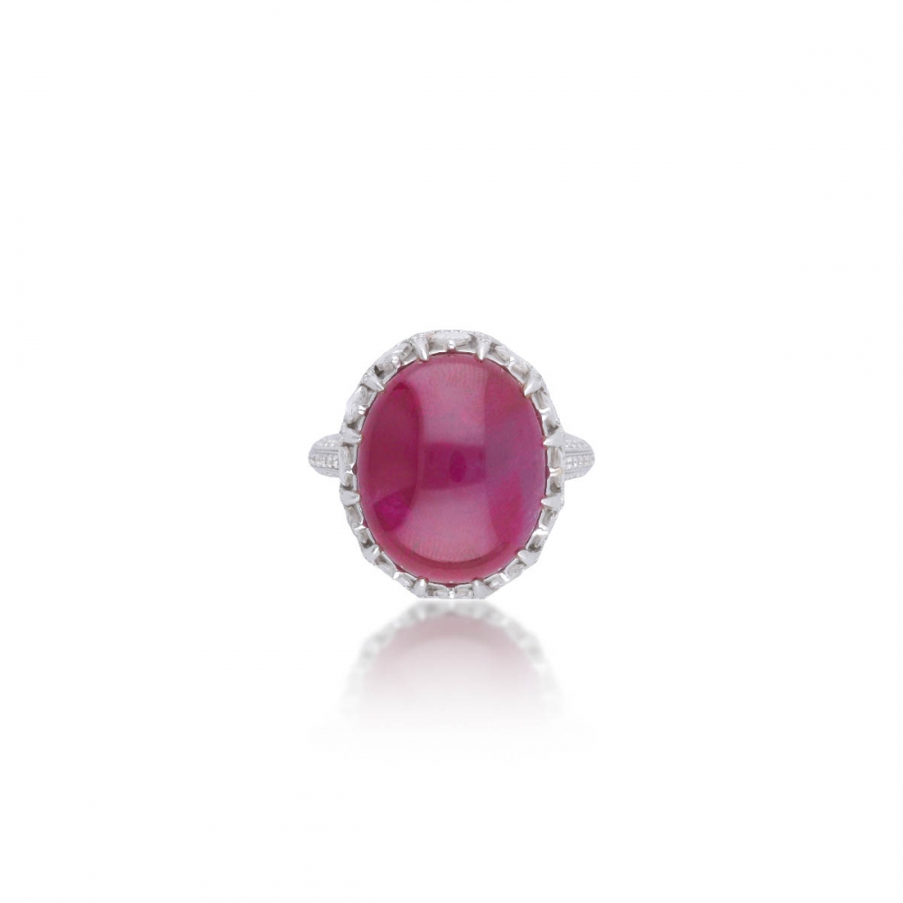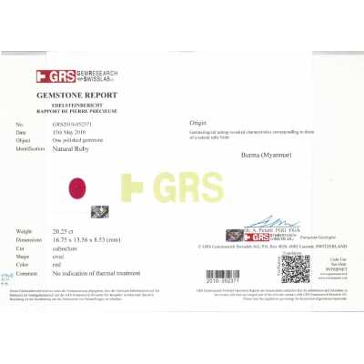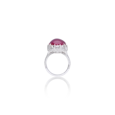這枚紅寶石戒指以 20.25 克拉天然緬甸紅寶石 為主石,橢圓形蛋面切割,比例飽滿,拋光細膩,呈現出深邃而純正的紅色調。寶石經 GRS 瑞士鑑定無任何加熱處理,在市場上極為稀有,具備高度鑑賞與保存價值。戒台以貴金屬鑲嵌,線條流暢,細節鑲工精緻,襯托主石的厚實重量感與穩定光澤。整體設計在華麗與內斂之間取得完美平衡,既保有寶石本身的原始魅力,也呈現出成熟而不張揚的品味,是一件能長久欣賞、細細品味其層次與質感的紅寶石佳作。