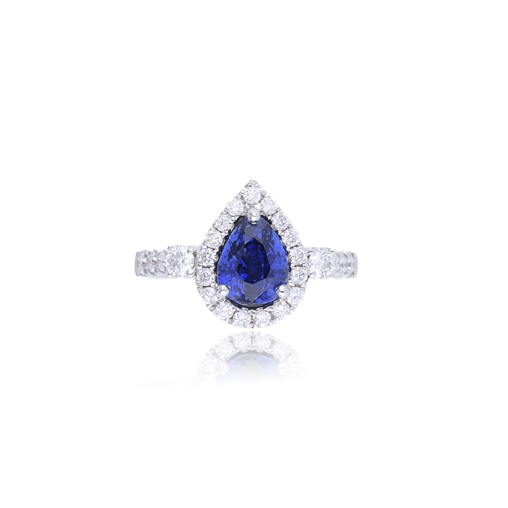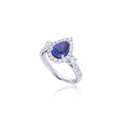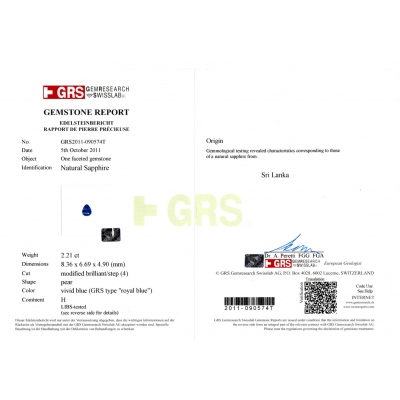 藍寶石中最高階的顏色就屬皇家藍。本件作品為產自斯里蘭卡有國際鑑定機構GRS認證的皇家藍顏色的水滴藍寶石。典雅風格不退流行的設計配上圓形明亮的白鑽,讓人想天天配戴著它。濃郁的藍色ㄧ直是英國皇室的首選,這也是本件作品的最佳顏色,歡迎您來鑑賞 。