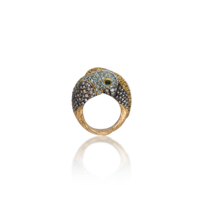 密釘鑲法,一般是將較小的寶石密集對稱的鑲在一起,相互之間透過共用爪的方式進行固定。這種方法可以使寶石整齊有序地排列,從而達到奢華、震撼的效果。通常,大面積的使用可以在珠寶的整個表面產生一片光彩,若作品鑲有主石,也可作為主要寶石的外圍裝飾,突顯主石更加高貴。美麗細緻的密釘鑲鑽線條,為此件設計增添璀璨光芒,搭配現今最受喜愛的鑽石及黃寶石,兩隻喜鵲造型更加增添此件作品的時尚風采,精心製作的珠寶作品皆是經典風格與永恆優雅的縮影。