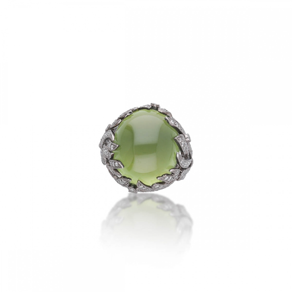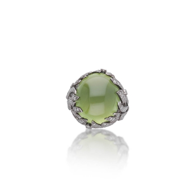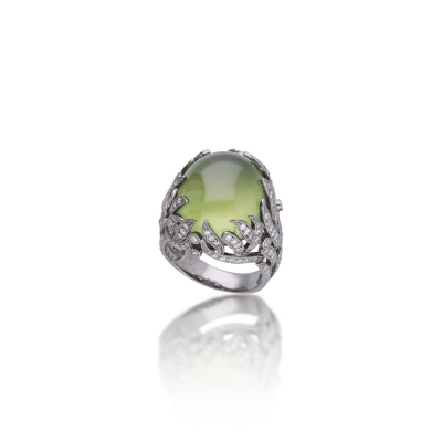 葡萄石長期作為冰種淺色翡翠的替代石,其實它的價值長期被低估,此戒指透過設計師及金工師傅的巧思,完美呈現出一個大器的作品,推薦給您