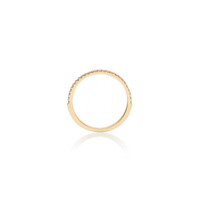 此款戒指以纖細線條展現低調優雅,採用18K金打造,金色溫潤襯托膚色。鑲嵌 25 顆小鑽,總重 0.12 克拉,細緻密鑲讓火彩均勻閃爍。設計簡單卻有質感,適合日常佩戴或疊戴,呈現輕盈卻不失精緻的風格。