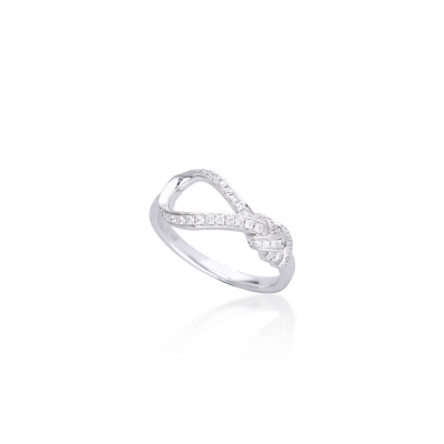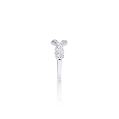 此款戒指設計成交錯曲線,宛如雙線交織環抱,象徵柔和與堅韌。材質為 18K金,光澤清亮。主鑽配置為 47顆鑽石,總重0.20克拉,排鑲效果讓鑽石在不同角度閃耀。線條流暢,適合單戴展現造型感,也能與其他戒指搭配,突顯時尚層次。