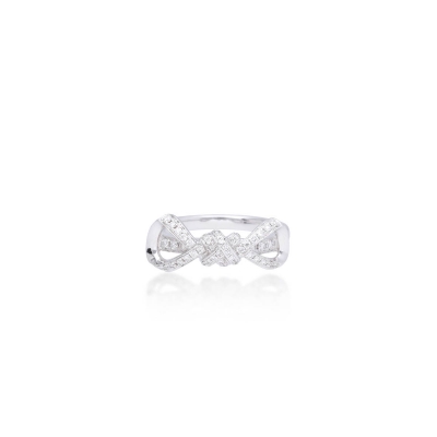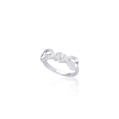 這枚戒指設計如緞帶蝴蝶結,18K金打造,鑲嵌 61 顆鑽石,總重 0.28 克拉。小鑽排列緊密,火彩閃爍連綿不斷,形成華麗光暈。日常搭配也都能凸顯浪漫與甜美氛圍。
