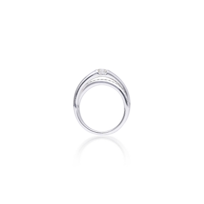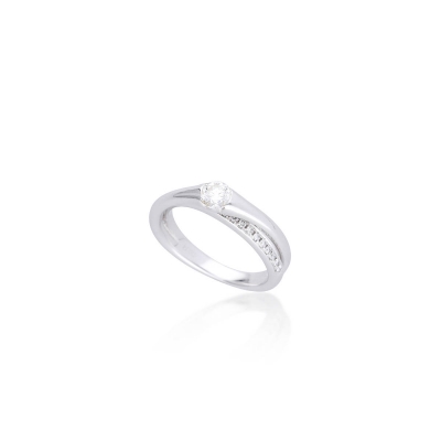 戒指造型簡潔,戒環帶有微微弧度,線條俐落。材質為18K金,整體設計舒適貼合。鑲嵌主鑽 0.30 克拉,成色 F、淨度 VS1,輔以 21 顆小鑽共 0.14 克拉,光澤感明亮。主鑽附有GIA 證書,品質有保障。外型低調卻帶有專業鑑定背書,適合作為日常配戴與重要場合的首飾。
