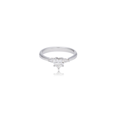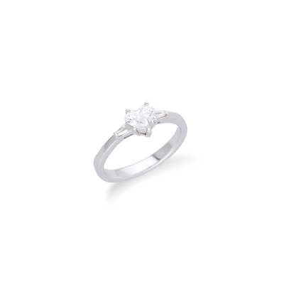 戒指以經典單鑽造型為主,搭配心形切割的主石,重量 0.50 克拉,成色 F、淨度 VS1,火彩璀璨。另鑲嵌 2 顆小鑽共 0.07 克拉,提升光澤感。材質為18K金,整體精緻而純淨。戒指附有 GIA 證書,保證真實與品質。簡潔的設計使其成為訂婚、紀念日或珍藏的理想選擇。