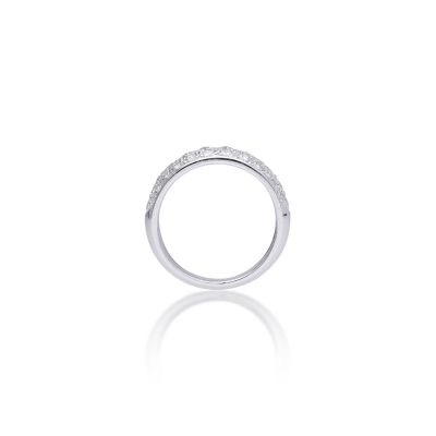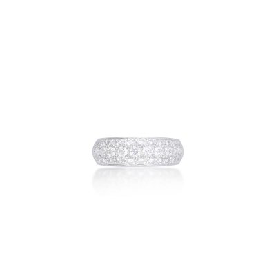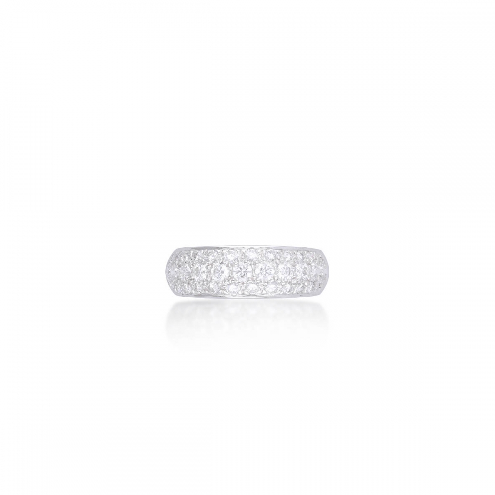 此款戒指設計簡潔大方,呈現圈式的排鑽風格。戒身以 18K金打造,線條流暢而貼合手型。整圈鑽石排列均勻,火彩細膩,讓戒指在低調中散發閃耀光澤,適合單獨佩戴展現質感,也能搭配其他戒指疊戴,成為日常穿搭的百搭款式。
