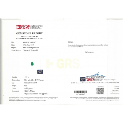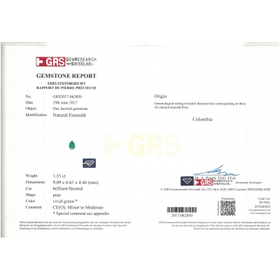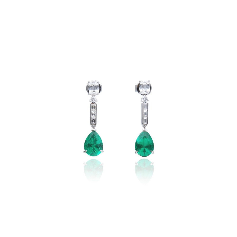 這對耳環以18K金精製而成,設計簡約典雅,展現高貴氣質。主石為來自哥倫比亞的水滴型祖母綠,分別重1.52克拉與1.36克拉,色澤濃郁鮮明,散發迷人綠光。祖母綠的優雅曲線搭配鑽石的晶亮火彩,形成和諧而奢華的對比。每顆主石均附有GRS原版證書,確保真實與珍稀。整體造型精緻大方,既可展現典雅氣質,又適合重要場合配戴,完美融合低調奢華與經典風格。