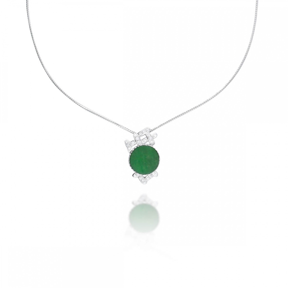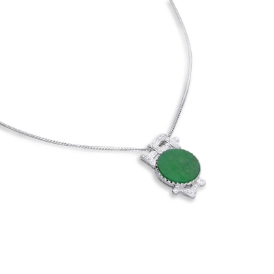 這條翡翠項鍊 以天然翡翠圓片為主體,呈現清透柔和的綠色光澤,象徵吉祥與平安。圓片周圍點綴精緻鑽石,微光閃爍,增添整體層次與奢華感。簡約而不失典雅的設計,將東方翡翠的傳統韻味與現代珠寶的精緻工藝完美融合。無論搭配日常服裝或正式禮服,都能凸顯佩戴者的品味與氣質。