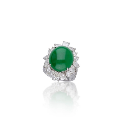 翡翠作為華人最具代表性的綠色寶石,不管是其溫潤優雅的氣質,有別於其他寶石的璀璨,其內斂的風格更能凸顯出女性的優雅,從古至今每一塊原石都是天地的寶貴賜予。就切割寶石來角度來說,翡翠蛋面是集所有整個翡翠原石中,最精華的地方,也就是正濃陽勻兼備才會考慮取出蛋面做為切磨的形式,此款蛋面戒指以經典的滿綠色翡翠為主體,更難得的是此翡翠戒指的主石顏色非常飽滿濃郁的滿綠外,翡翠玉質溫潤瑩透,璀璨鑽石輔以圍繞,充分展現華人女性特有的婉約氣質,光華更盛,是雅致品味的表達,推薦給您。