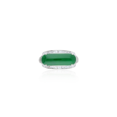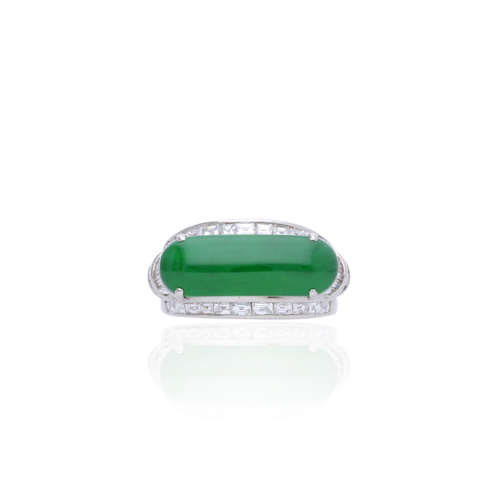 翡翠為玉中之王,由於開採困難,每一塊原石都是天地的寶貴賜予。此款戒指以經典的老坑色綠色的翡翠為主體,翡翠玉質溫潤瑩透,璀璨鑽石輔以圍繞,展現獨樹一幟的優美氣質之外,剛柔並濟,光華更盛,是雅致品味的表達。