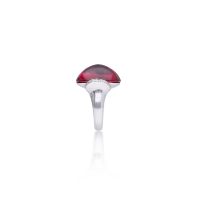 此件紅碧璽戒指以鑽石鑲嵌,綻放現代簡約優雅的氣息,紅碧璽寶石切割形式是復古設計的Sugarloaf ,有別於一般的蛋面更顯得氣質,呈現高貴質感,與周邊的鑽石相映成趣,寶石散發出奢華的光澤度,讓您舉手投足散發出美豔的公主氣息。
