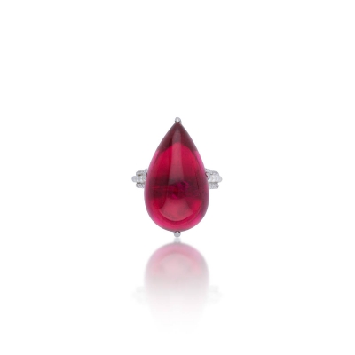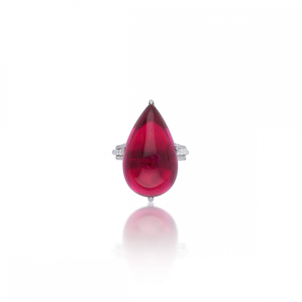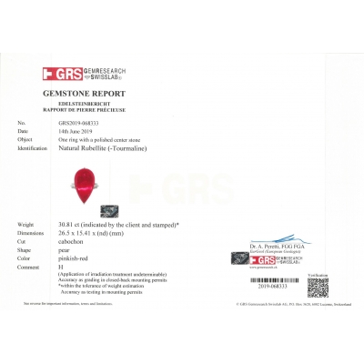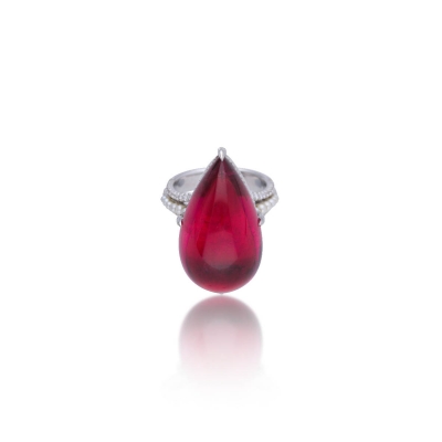 這顆重達30.81克拉的水滴形切割紅寶碧璽,色澤濃豔奪目,展現出絕佳的透明度與火彩,氣勢非凡。搭配特殊設計的白水晶底座、璀璨鑽石與柔潤小珍珠,層次分明又和諧雅緻。整體設計高貴典雅,兼具收藏與佩戴價值。附GRS國際證書,品質更具保證,是追求獨特與尊榮氣質人士的極致之選。