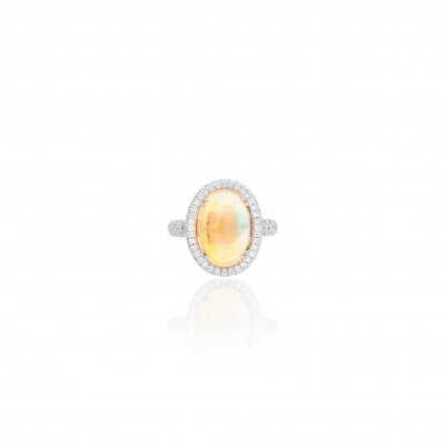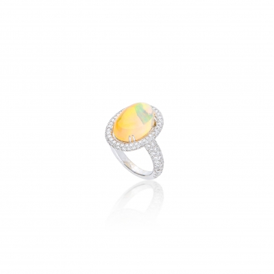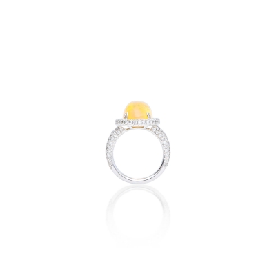 這款戒指的中心是一顆閃爍著奇幻色彩的蛋白石,宛如大自然的藝術品,周圍精心鑲嵌了璀璨的密釘鑲鑽石,為戒指增添了華麗的光芒和優雅的氣質。密釘鑲的工藝讓每顆鑽石緊密相連,形成一圈光彩奪目的鑽石光環,完美襯托出蛋白石的獨特魅力,不僅展現了精湛的工藝,更是品味與奢華的象徵,無論是作為日常佩戴還是特殊場合的點綴,都能為您帶來無與倫比的光彩與自信。