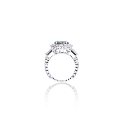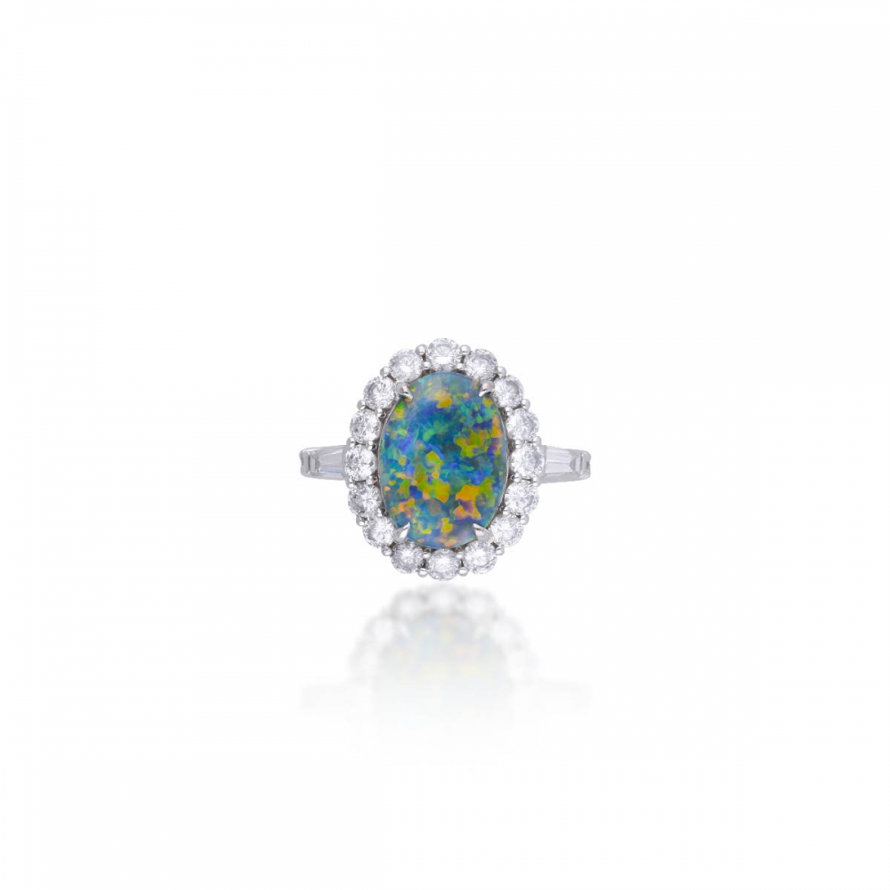 這枚戒指令人驚艷,主石為一顆2.33克拉橢圓形五彩黑蛋白石,其獨特的遊彩現象,隨光線流轉閃爍虹霓般繽紛色澤。主石外圍以一圈璀璨白鑽緊密環繞,兩側更飾以俐落的梯鑽線條簡潔而現代。戒圈亦密鑲鑽石,與整體設計相呼應。戒台採用18K白金材質,極致純白的金屬光澤完美襯托出蛋白石的奇幻色彩與鑽石的耀眼光芒,打造出既神秘又摩登的藝術傑作。