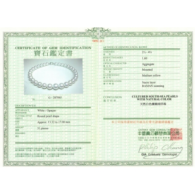 這串天然養殖白色南洋珍珠,珠徑達13-17mm,屬於市場上極為罕見的大顆尺寸。顆顆圓潤飽滿,光澤細膩,無論從外觀還是質地上,都展現出頂級珍珠的典雅與不凡。