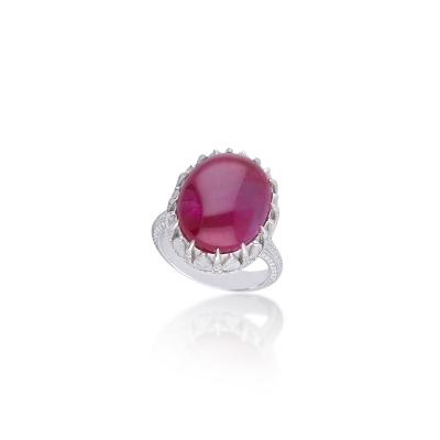 這枚紅寶石戒指以 20.25 克拉天然緬甸紅寶石 為主石,橢圓形蛋面切割,比例飽滿,拋光細膩,呈現出深邃而純正的紅色調。寶石經 GRS 瑞士鑑定無任何加熱處理,在市場上極為稀有,具備高度鑑賞與保存價值。戒台以貴金屬鑲嵌,線條流暢,細節鑲工精緻,襯托主石的厚實重量感與穩定光澤。整體設計在華麗與內斂之間取得完美平衡,既保有寶石本身的原始魅力,也呈現出成熟而不張揚的品味,是一件能長久欣賞、細細品味其層次與質感的紅寶石佳作。