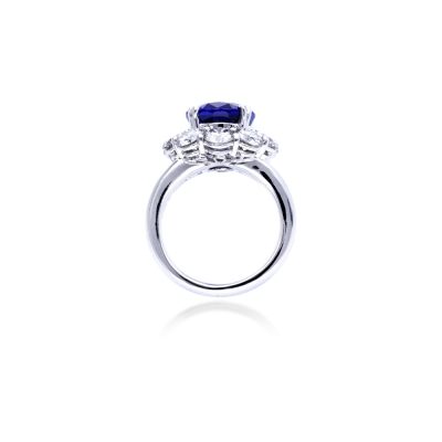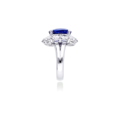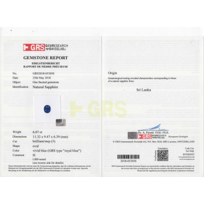 藍寶石屬高檔寶石,是五大寶石之一,位於鑽石丶紅寶石之後,排名第三。其象徵忠誠、堅貞丶慈愛和誠實,被稱為「命運之石」。其產地不多主要分布在緬甸丶斯里蘭卡丶喀什米爾丶馬達加斯加及泰國等地。就質而言,以喀什米爾丶緬甸及斯里藍卡最佳。皇家藍(GRS Royal Blue或稱Vivid Blue)是形容藍寶石的漂亮色彩。皇家藍的色彩以正藍色為主,色澤濃郁、深沈實在的感覺,非常受收藏家歡迎。英國皇室1981年查爾斯王子向黛安娜王妃求婚,就是以斯里蘭卡藍寶石作為婚戒主石,正因為如此,讓斯里蘭卡藍寶石價格開始越漲越高。 戒檯上的藍寶石主石是經由國際極具公信力的GRS鑑定過,其設計也與黛妃的藍寶石戒極相似,非常的高雅貴氣,實具收藏之價值。