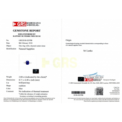 本件作品設計簡約大方,2克拉以上的尺寸非常難得,更是沒有經過優化處理的吳燒藍寶石,不管是日常配戴或是場合都能展現出您的優雅氣質,推薦給您。藍寶石以其晶瑩剔透的美麗顏色,被古代人們蒙上神秘的超自然色彩,被視為吉祥之物。早在古埃及、古希臘和古羅馬,被用來裝飾清真寺、教堂和寺院,並作為宗教儀式的貢品,而此款戒指上的藍寶石附有國際GRS證書,上面特別標示來自最好的藍寶石產地斯里蘭卡,更加證明了此戒指的優良品質與日後的市場價值。斯里蘭卡是世界上歷史最悠久、最重要的藍寶石產地,也是非常著名的藍寶石礦源之一。