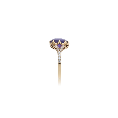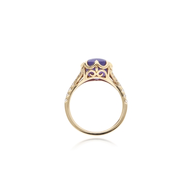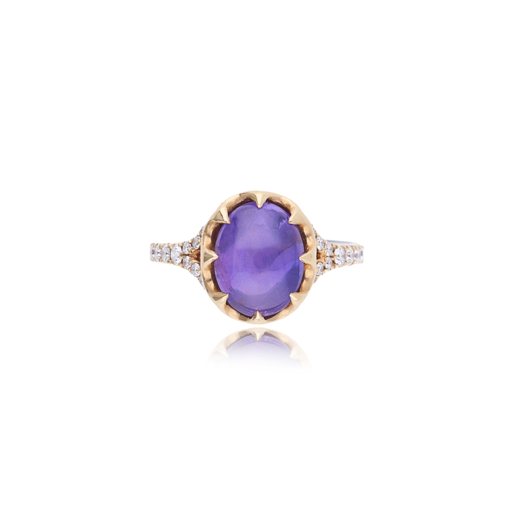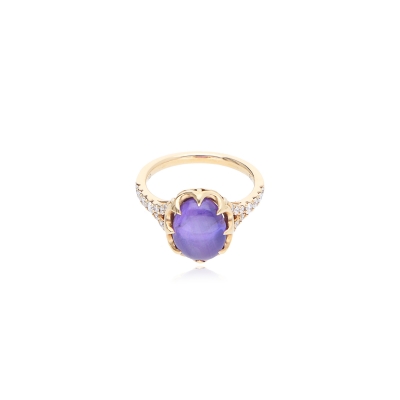 當藍寶石內部生長有大量細微的稱作金紅石的礦物後,打磨成蛋面形的寶石頂部會呈現出六道星芒,這樣的藍寶石即被稱作星光藍寶石。藍寶星石戒指的星光效應與貓眼效應成因類似,在平行光線照射下,以弧面形切磨的某些特殊寶石表面呈現出兩條或兩條以上交叉亮線的現象,稱為星光效應,其價值取決於寶石的六道星線的交匯點的位於寶石中央。星線的完整、明亮。 紫色藍寶星石蛋面弧度在鑽石戒檯的烘托之下,顯得更加華貴而富有動感,多個角度都散發出飽滿的光澤度,華貴而充滿典雅的宮廷格調。