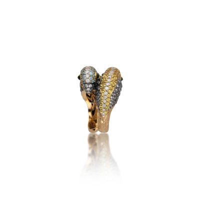 密釘鑲法,一般是將較小的寶石密集對稱的鑲在一起,相互之間透過共用爪的方式進行固定。這種方法可以使寶石整齊有序地排列,從而達到奢華、震撼的效果。通常,大面積的使用可以在珠寶的整個表面產生一片光彩,若作品鑲有主石,也可作為主要寶石的外圍裝飾,突顯主石更加高貴。美麗細緻的密釘鑲鑽線條,為此件設計增添璀璨光芒,搭配現今最受喜愛的鑽石及黃寶石,兩隻喜鵲造型更加增添此件作品的時尚風采,精心製作的珠寶作品皆是經典風格與永恆優雅的縮影。